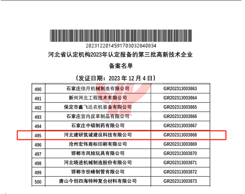 2023年12月20日,全國高新技術(shù)企業(yè)認定管理工作領(lǐng)導小組辦公室公示了河北省認定機構(gòu)2023年認定報備的第三批高新技術(shù)企業(yè)備案名單,河北建研筑誠建設(shè)科技有限公司順利通過了國家高新技術(shù)企業(yè)認定(證書編號GR202313003868),標志著公司在科技創(chuàng)新的道路上又邁出了堅實的一步。